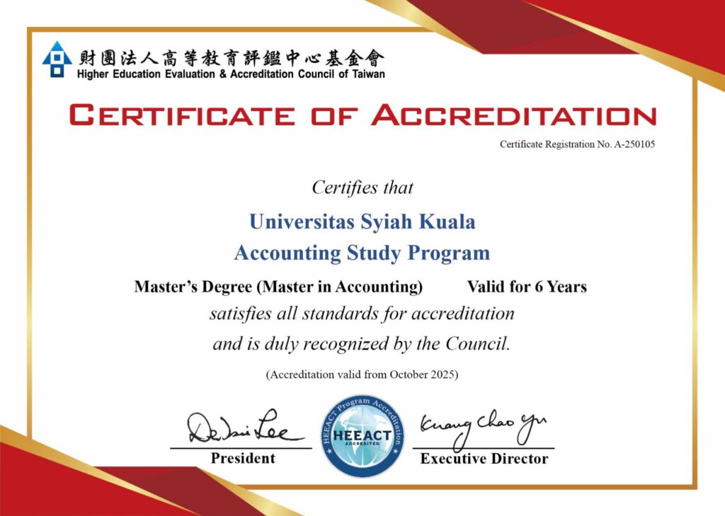 Banda Aceh — Fakultas Ekonomi dan Bisnis Universitas Syiah Kuala (FEB USK) kembali menorehkan prestasi membanggakan. Tiga program studi di bawah naungan Departemen Akuntansi resmi meraih akreditasi internasional dari Higher Education Evaluation and Accreditation Council of Taiwan (HEEACT). Sertifikat akreditasi tersebut disahkan pada Rabu (29/10) dan berlaku selama enam tahun ke depan, hingga Oktober 2031.